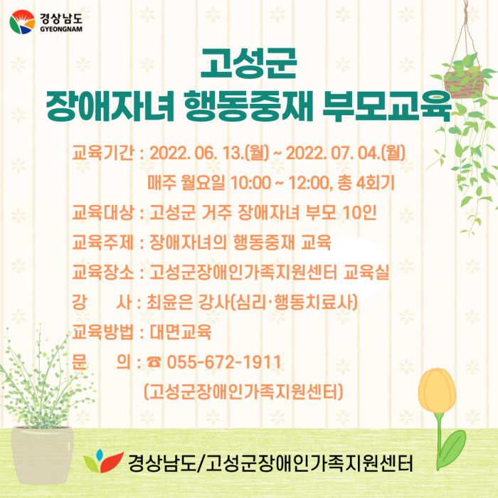 행동중재 부모교육 페이지 정보 작성자 고성장가센터 조회 2,355회 작성일 22-06-16 10:53 본문 #장가센터소식#고성군 #장애인부모교육#고성군장애인가족지원센터발달장애녀의 행동중재를 주제로4회기에 걸쳐 부모교육을 진행합니다.중도에 신청이 가능하니 많은 관심과 참여바랍니다^^!기간 : 2022. 06. 13.(월) ~ 2022. 07. 04.(월) 매주 월요일 10:00 ~ 12:00, 총 4회기대상 : 고성군 거주 장애자녀 부모 10인주제 : 장애자녀의 행동중재 교육장소 : 고성군장애인가족지원센터 교육실강사 : 최윤은 강사(심리·행동치료사)방법 : 대면교육문의 : ☎ 055-672-1911 (고성군장애인가족지원센터) 목록 이전글학령기 부모교육 22.06.02 다음글학령기 부모교육 22.06.16